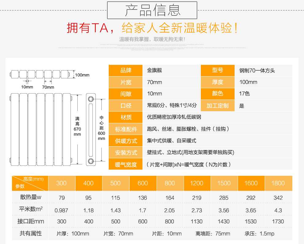 金旗艦鋼制暖氣片,一體成形,無焊點,水流量大,壽命長,造型美觀;具有熱穩(wěn)定性好,附著力強,耐腐蝕強,耐久性高、光澤度強,鋼制暖氣片5年質(zhì)保,只換不修。